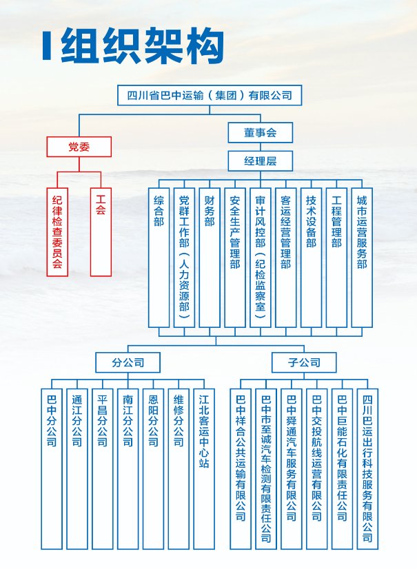 巴运集团成立于1993年10月,注册资本金3581.4745万元,资产总额16亿元,现系市国资运营集团二级子公司。公司具有国家一级客运资质,被交通运输部列为重点联系企业,先后荣获“四川省文明单位、中国道路运输百强诚信企业、五星级汽车客运站”等荣誉称号。公司核心业务涵盖道路客运、城市公交、出租汽车、汽车检测、汽车维修、汽车租赁、智慧停车、城管服务、能源销售、航线运营等多个领域,培育新能源汽车充电站(桩)、广告等增值业务。公司拥有各类运输车辆1300余台、客运线路300余条、客运站8个、加油加气站3座。现有员工近900人,其中:中共党员145人,初级以上技术职称55人。