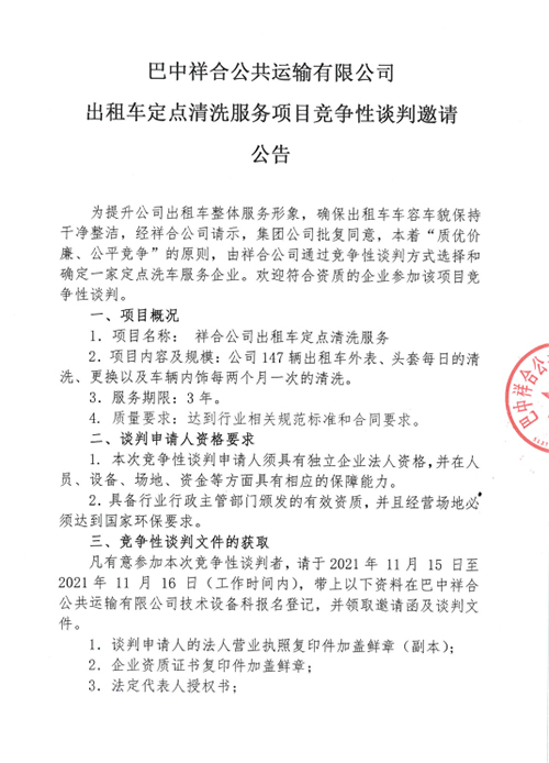 巴中祥合公共运输有限公司 出租车定点清洗服务项目竞争性谈判邀请 公告2021-11-12 16:13:10