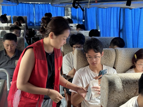 (图为:车站志愿者正在给新生及旅客发放免费的矿泉水)