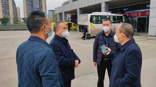 (2022年12月3日10:00县交通运输局李天志局长、交通服务中心苟家礼主任、县交运局疫情防控指挥办杨力主任、巴运集团通江县分公司苟于浩经理在城南车站现场指挥学生转运工作)