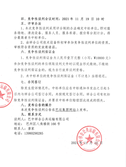 巴中祥合公共运输有限公司 出租车定点清洗服务项目竞争性谈判邀请 公告2021-11-12 16:13:10