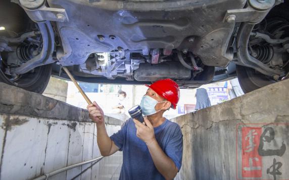 (认真检查每辆出站车辆)