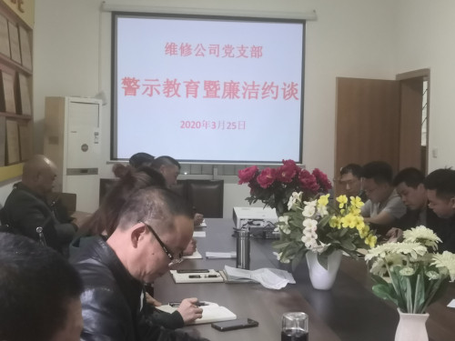 2020年3月25日上午,维修公司党支部开展主题党日活动,根据集团公司统一安排,组织在岗党员、副科长以上非党员管理者及入党积极分子观看警示片《处心弄权招投标 人生敛来“烂尾楼”》,以案说法,进行廉洁教育;同时,支部书记对参会人员进行廉洁约谈。