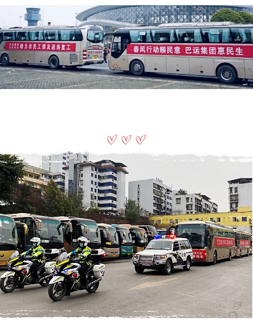 2月24日晚21时45分,巴中市组织的2021年首趟包机运送农民工返岗复工航班起飞。巴运集团江北客运中心站为此次186农民工“打飞的”出行,提供了免费送达机场的“春风”服务,这也是车站积极响应巴中市政府倡导的“东西协作、山海相牵、启航创造美好生活”理念,首次实现“公空”联动,协同“作战”,助力农民工返岗复工,开启了“春风行动”服务新模式。
