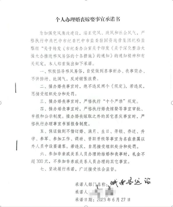 (图为通江分公司《个人办理婚丧嫁娶事宜承诺书》)