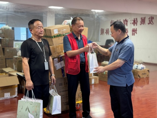 (工会主席邵扬为一线职工发放防暑降温药品)