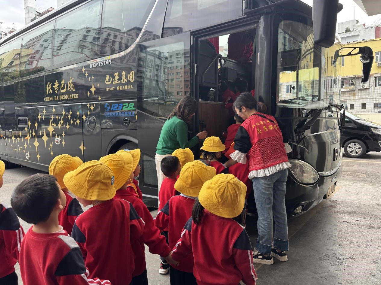 (图为:小朋友正在排队上车)