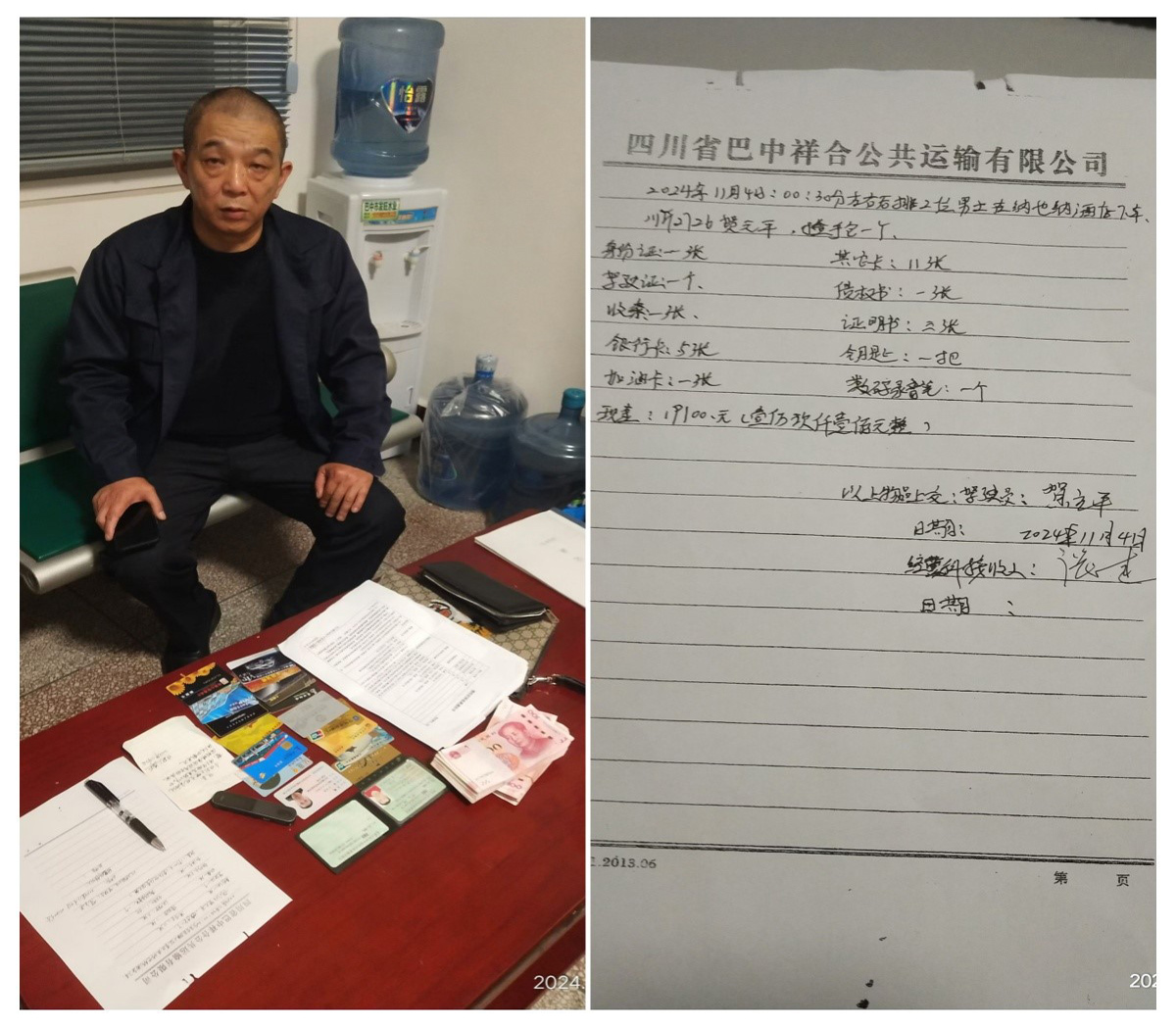 (图为驾驶员与值班人员清点财务并做登记) 公司高度重视,立即通过各种渠道寻找失主,经过多方打听,最后终于联系上了失主王先生。11月4日上午9时许,王先生到祥合公司顺利取回了自己的手包,并当面清点确认了所有物品,连连道谢。