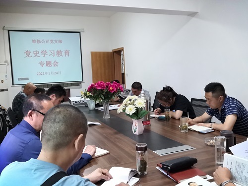 2021年5月24日,维修公司党支部开展主题党日活动,组织党员、副科长以上非党员管理者、入党积极分子,观看庆祝中国共产党成立100周年纪录片—《改造中国与世界》、《从石库门到南湖》,集中学习习近平论中国共产党党史之《始终做到初心如磐 使命在肩》,继续党史学习教育。
